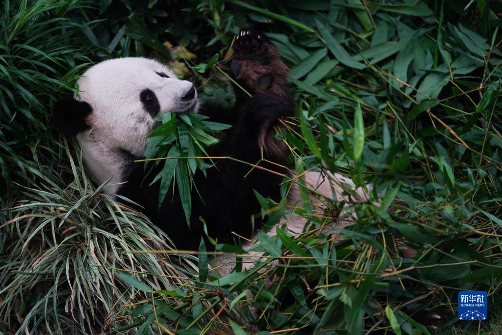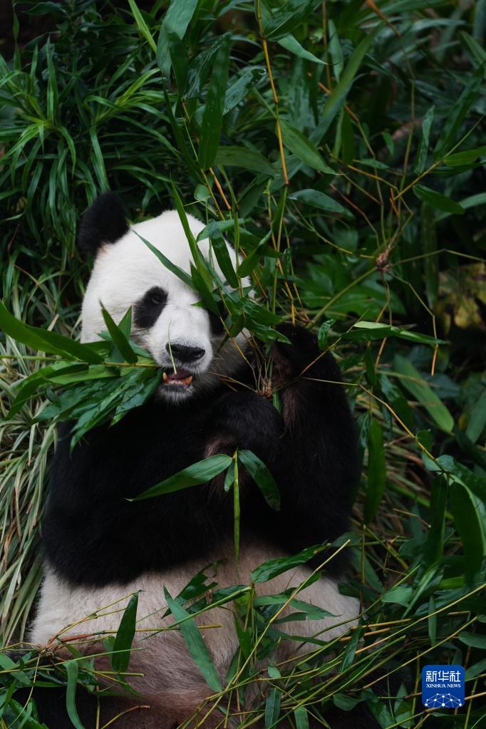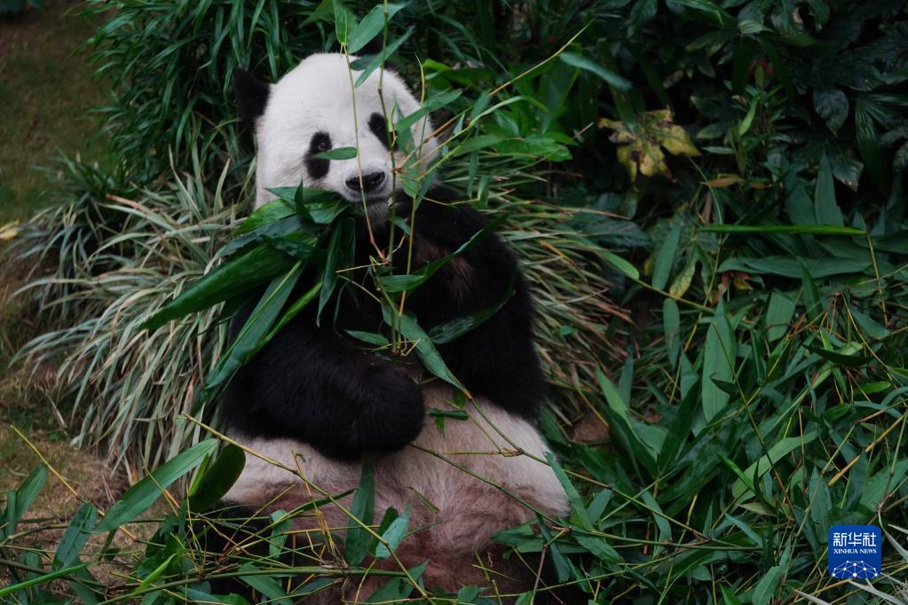在香港海洋公園,大熊貓“樂樂”在吃早餐(4月19日攝)。新華社記者 王申 攝