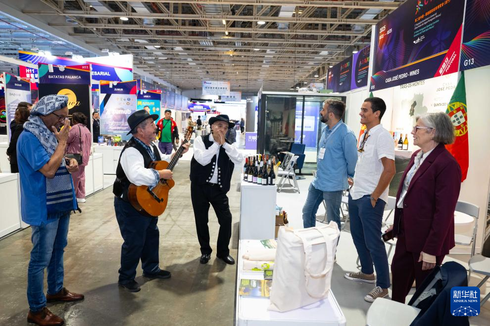 10月22日,演员在第二届中国—葡语国家经贸博览会(澳门)上与参展者互动。新华社发(张金加 摄)