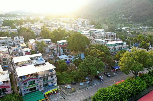 從港島出發向北,經九龍,到新界,穿過長長的龍山隧道,再開上全長11公里的香園圍公路,一路行駛,漸入群山環抱:左手邊是深圳梧桐山下的居民小區,右手邊的白虎山下,散落著一個個客家村落。