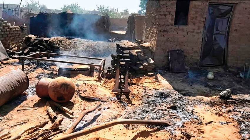 这是2024 年12月11日在苏丹西部北达尔富尔州首府法希尔的扎姆扎姆难民营拍摄的遭炮击的房屋