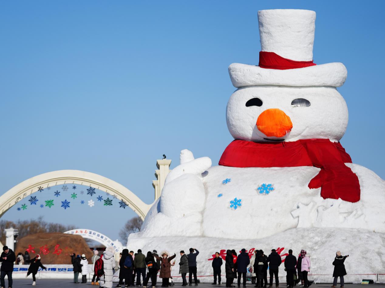 游客在太阳岛雪博会园区门口的大雪人旁拍照。新华社记者王建威 摄