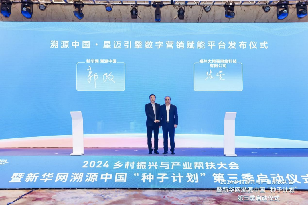 8月23日,2024乡村振兴与产业帮扶大会暨新华网溯源中国“种子计划”第三季启动仪式在哈尔滨太阳岛拉开帷幕。新华网移动互联网事业群总经理陈华、城市公共艺术研究中心副主任宁江生、福州大拇哥网络科技有限公司总经理林明生共同发布溯源中国•星迈引擎数字营销赋能平台。新华网移动互联网事业群市场总监郭政与福州大拇哥网络科技有限公司董事长张星正式签署合作协议。