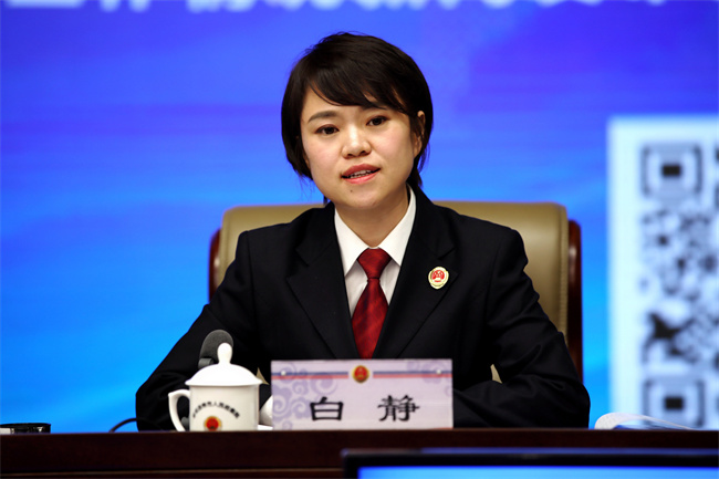 白靜在新聞發布會上介紹呼和浩特市檢察院公益訴訟檢察工作。
