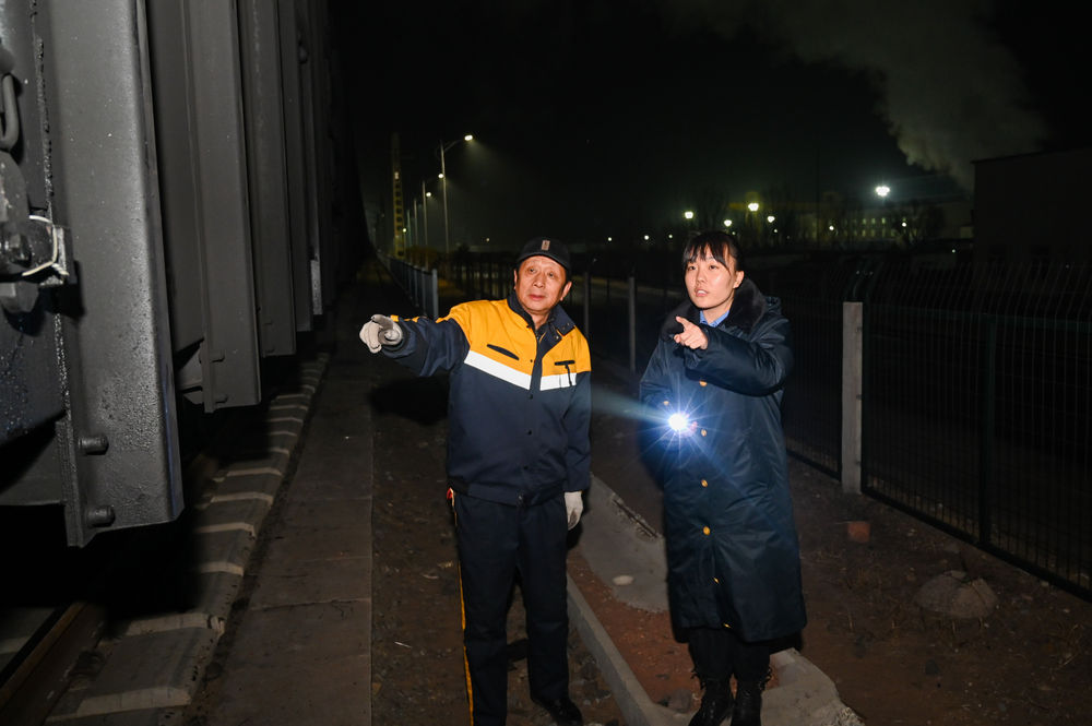 ↑1月20日,在包頭貨運中心大牛地車間,張芳(右)和同事在查看貨運列車情況。