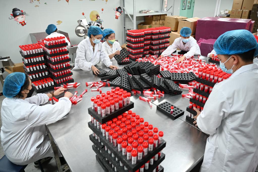 3月16日,位于廈門生物醫藥產業園的美林美邦(廈門)生物科技有限公司的員工在包裝滅活型一次性病毒采樣管。 新華社記者 林善傳 攝