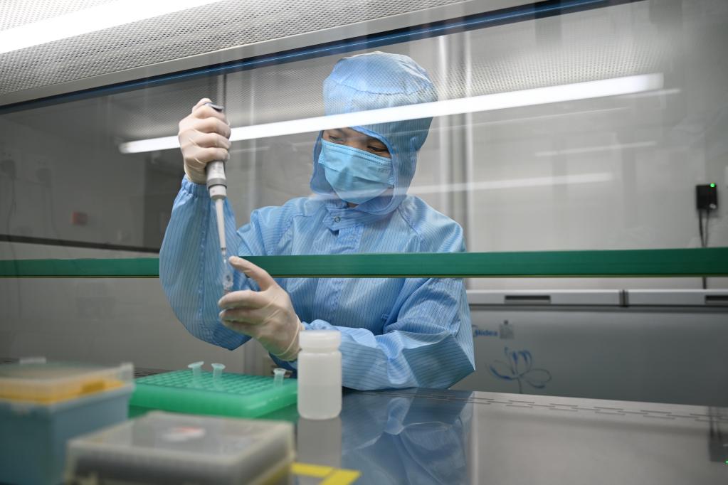 3月16日,美林美邦(廈門)生物科技有限公司員工在分裝滅活型病毒保存液。 新華記者 林善傳 攝