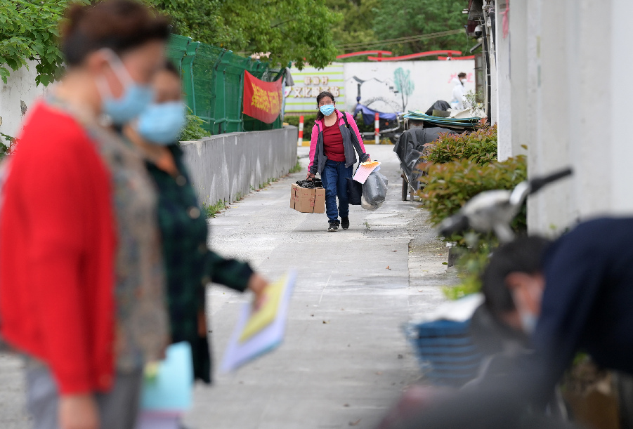 ↑4月24日,由方艙醫(yī)院返回的村民王女士走入村中家門口的小路。當(dāng)日起,上海市浦東新區(qū)北蔡鎮(zhèn)聯(lián)勤村村民陸續(xù)從隔離點(diǎn)回家。