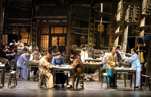 大傻楊敲打牛胯骨說著數來寶登臺,大幕徐徐舒展,晚清北京老裕泰茶館內,八張八仙桌依次擺開,店里堂外人聲嘈雜,悠然的鴿哨聲劃空而過,灶上的炒勺噼啪作響……