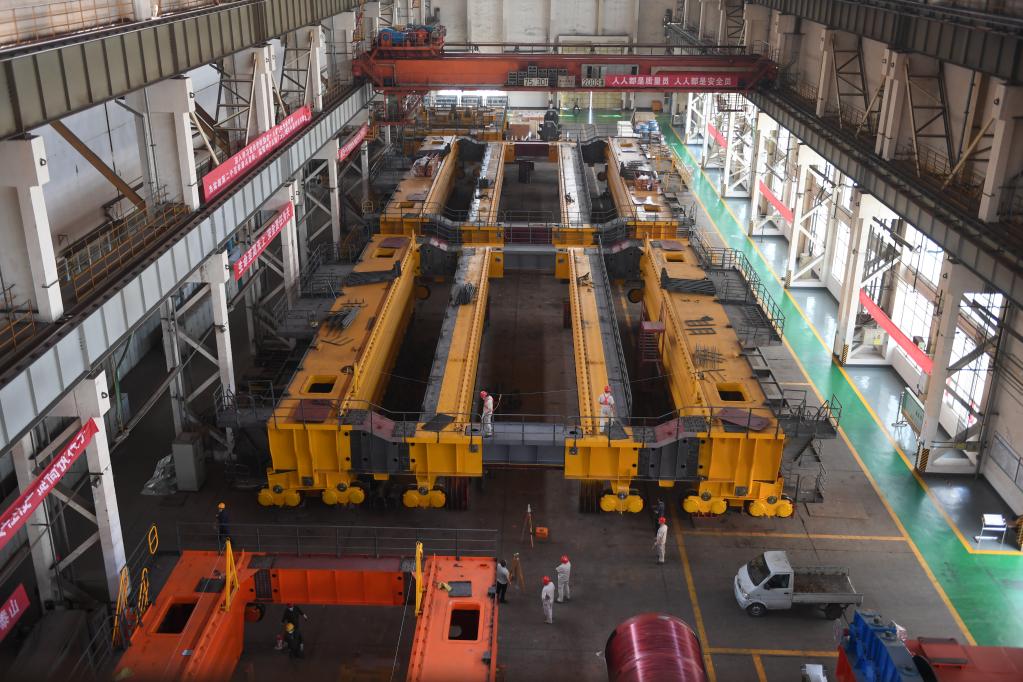 在太重集團起重機分公司車間,550噸鑄造起重機正在進行裝配作業。