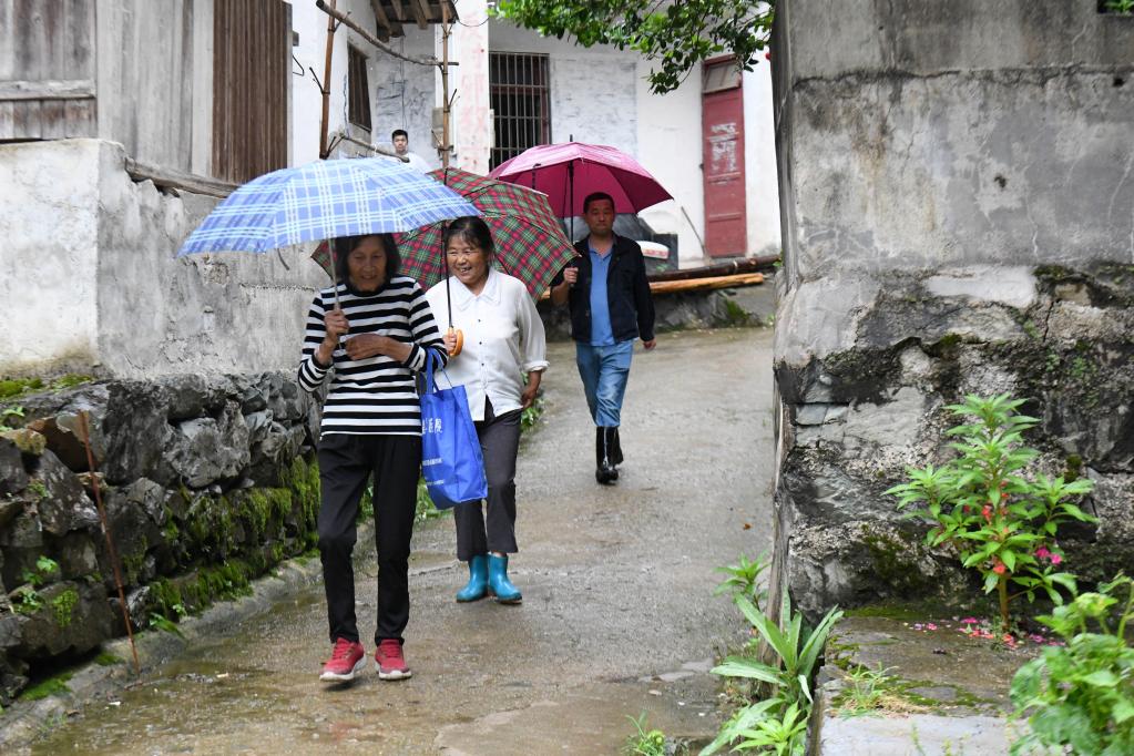 19日下午,天空淅淅瀝瀝下著小雨,在安徽省黃山市徽州區(qū)呈坎鎮(zhèn)容溪村,村民胡愛萍和鄰居一起冒雨走出家門,坐上鎮(zhèn)政府安排的汽車,前往楊干集中安置區(qū)。