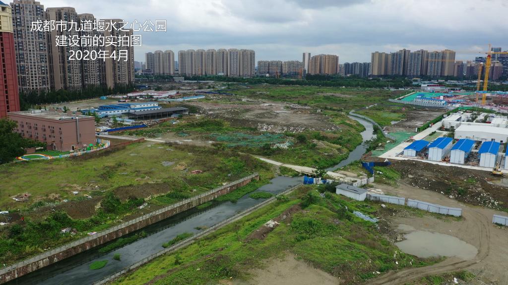 作為沱江流域成都段治理模式的范例,九道堰河流域被確定為生態文明建設主題公園。上圖為公園建設之前的衛星圖和實拍圖,建設前,這里雜草叢生,河道淤積,有的河段成為臭水溝。下圖為公園建設后的衛星圖和實拍圖。
