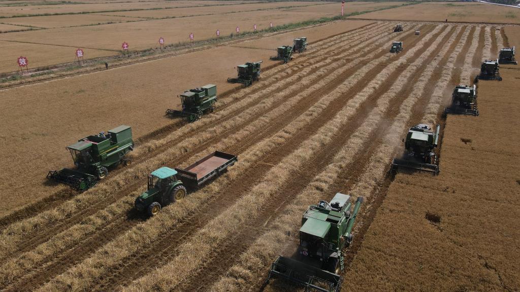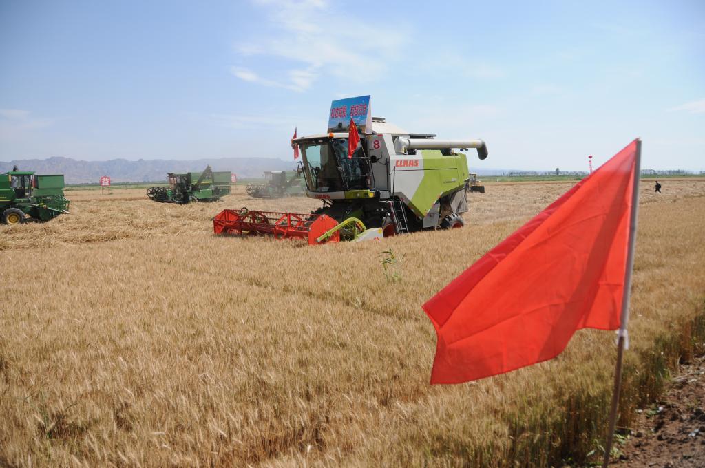 臨河區新華鎮十萬畝高產高效糧食生產示范園區小麥開鐮。新華社記者 李云平攝