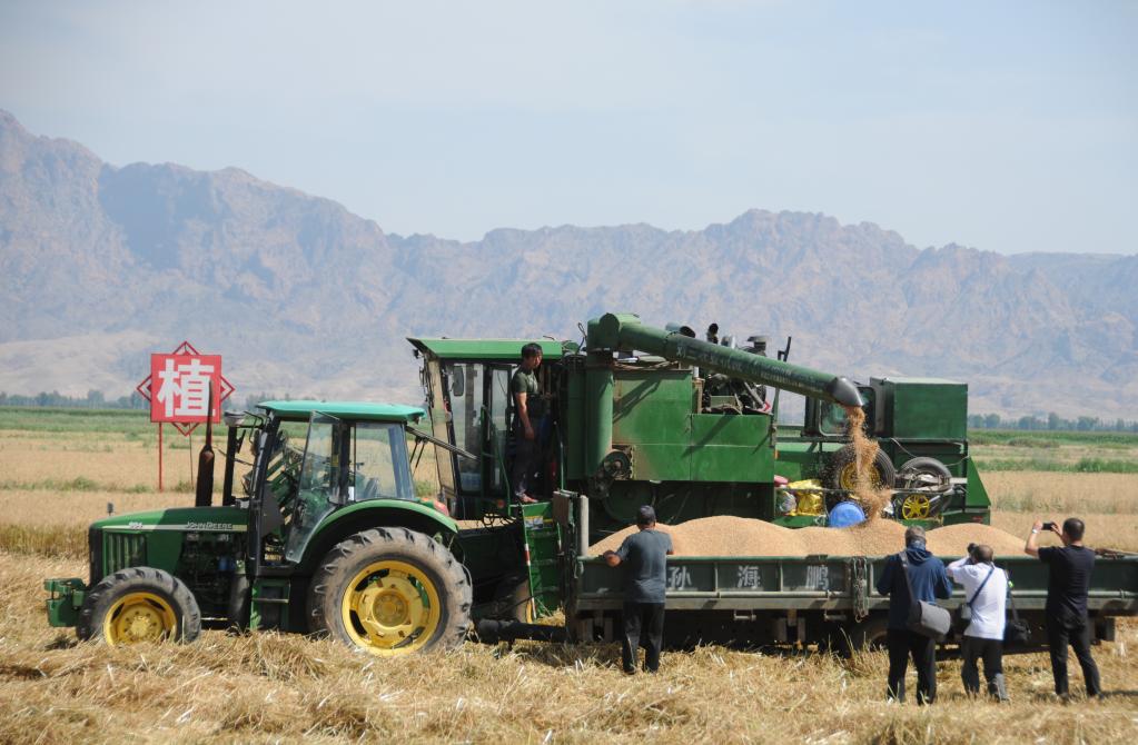 在小麥收獲現場,一臺臺聯合收割機往返作業,一粒粒小麥如潮水般涌入車箱,農民們開著拖拉機運糧回家。“今年,在小麥生長前期,氣候冷涼,有利于蹲苗;在生長后期,溫度適宜,沒有出現干熱風,所以小麥植株高、莖稈粗、穗型大、顆粒滿。根據現場測產數據顯示,每畝地大約種植42萬株小麥,平均每個麥穗結籽48粒到50粒,預計每畝增產5%到10%。”巴彥淖爾市農牧局種植業科科長張華說。
