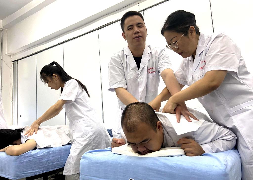 圖為張琳(右一)在實訓室教學生推拿手法。新華社記者魏夢佳攝