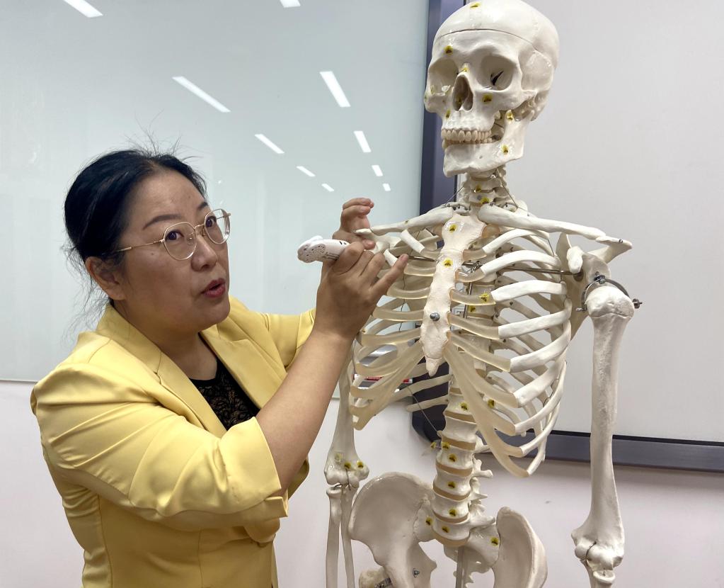為此,張琳和老師們一起利用現有技術開發了人體語音腧穴和骨骼模型。將模型上的穴位、經絡線設計成凸點、凸線,或貼上電子標簽,學生們用手觸摸這些位置時,通過電子點讀筆點觸,就能響起語音,告訴他們這些穴位、經絡或骨骼部位的名稱。