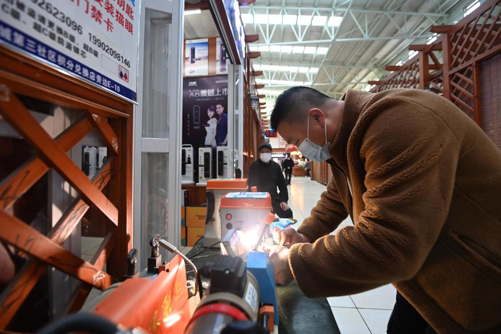 在中新天津生態(tài)城第三社區(qū)中心,一家開鎖行經(jīng)營者正在為顧客配鑰匙。新華社記者 趙子碩 攝
