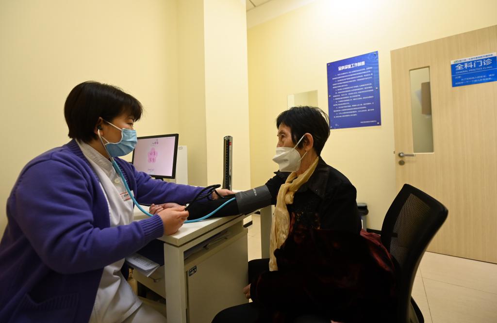 在中新天津生態(tài)城第三社區(qū)衛(wèi)生服務(wù)中心,醫(yī)生在為患者測量血壓。新華社記者 趙子碩 攝
