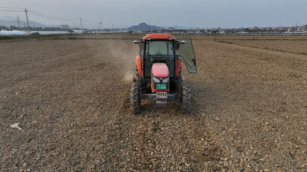 3月14日,在福建惠安一片田地上,無(wú)人駕駛拖拉機(jī)在進(jìn)行耕地作業(yè)(無(wú)人機(jī)照片)。新華社記者 周義 攝