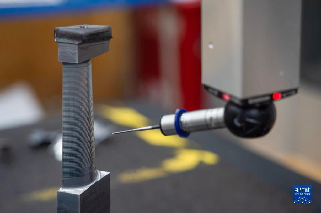 在哈電集團(tuán)哈爾濱汽輪機(jī)廠有限責(zé)任公司葉片分廠數(shù)字化(智能)車間,三坐標(biāo)測(cè)量機(jī)在測(cè)量工件的有關(guān)數(shù)據(jù)(3月29日攝)。新華社記者 謝劍飛 攝