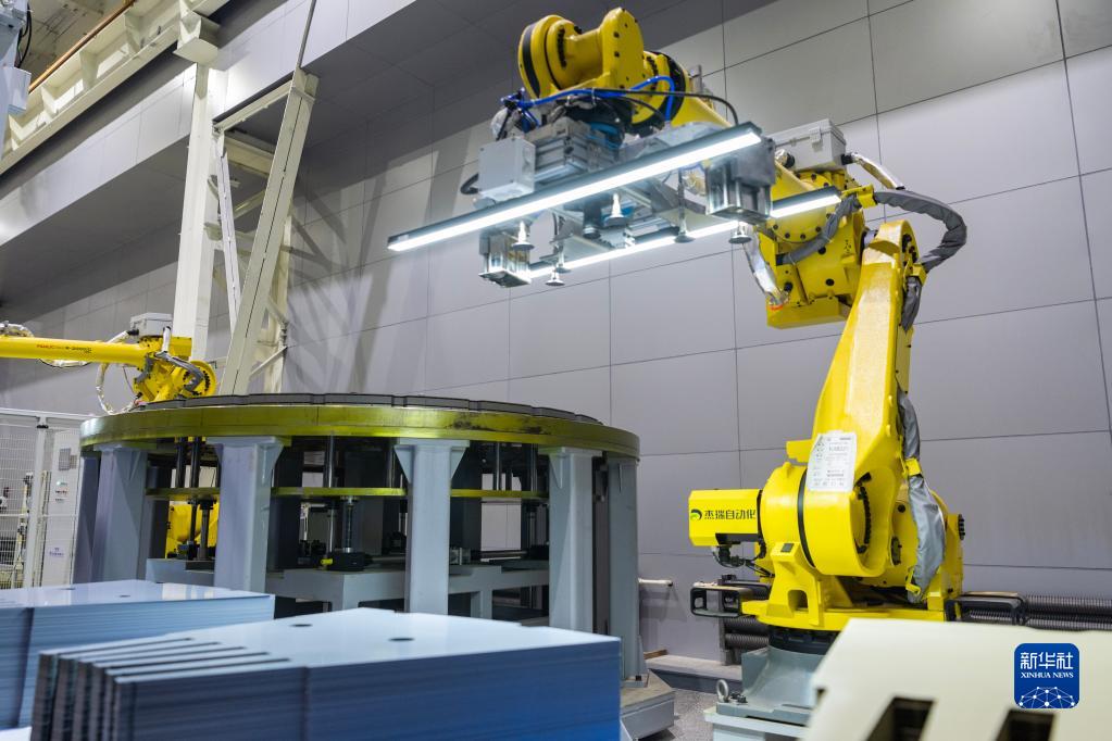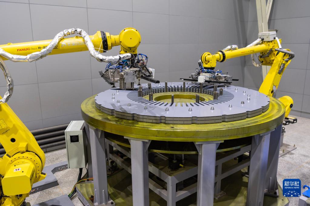 在哈電集團(tuán)哈爾濱電機(jī)廠有限責(zé)任公司的生產(chǎn)車間,智能疊片機(jī)器人在進(jìn)行自動(dòng)化作業(yè)(3月29日攝)。新華社記者 謝劍飛 攝