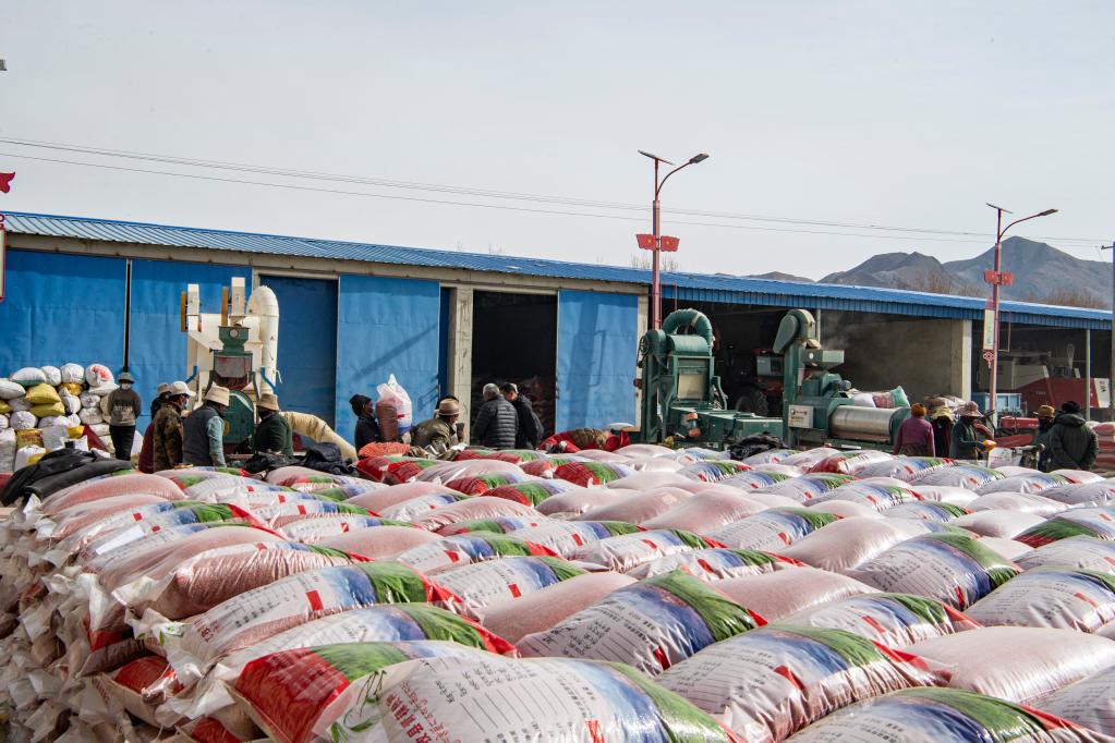 在西藏日喀則市江孜縣紫金鄉努堆村的農機農民專業合作社內,兩臺青稞種谷物精選機正開足馬力,給新收獲的青稞良種過篩、除雜、包衣、裝袋,50公斤一袋的青稞良種已碼滿大半個院子。