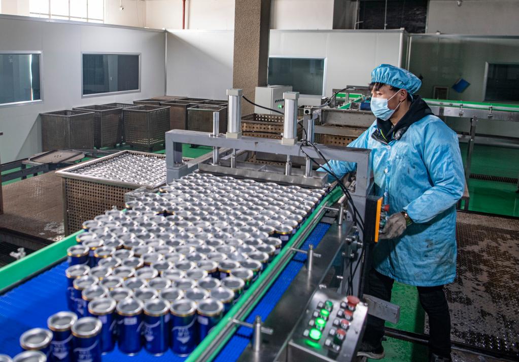 在西藏桑旦崗青稞酒業有限責任公司,工作人員正在操作青稞啤酒生產線(3月20日攝)。新華社記者 孫非 攝