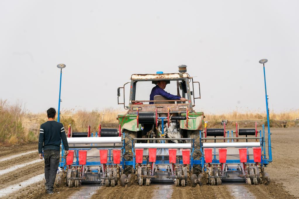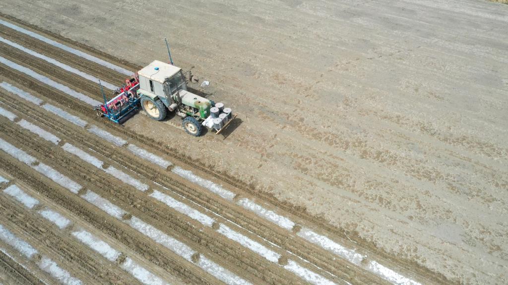 爾肯·熱衣木正在進行棉花春播(4月17日,無人機拍攝)。 新華社發 (汪志鵬 攝)