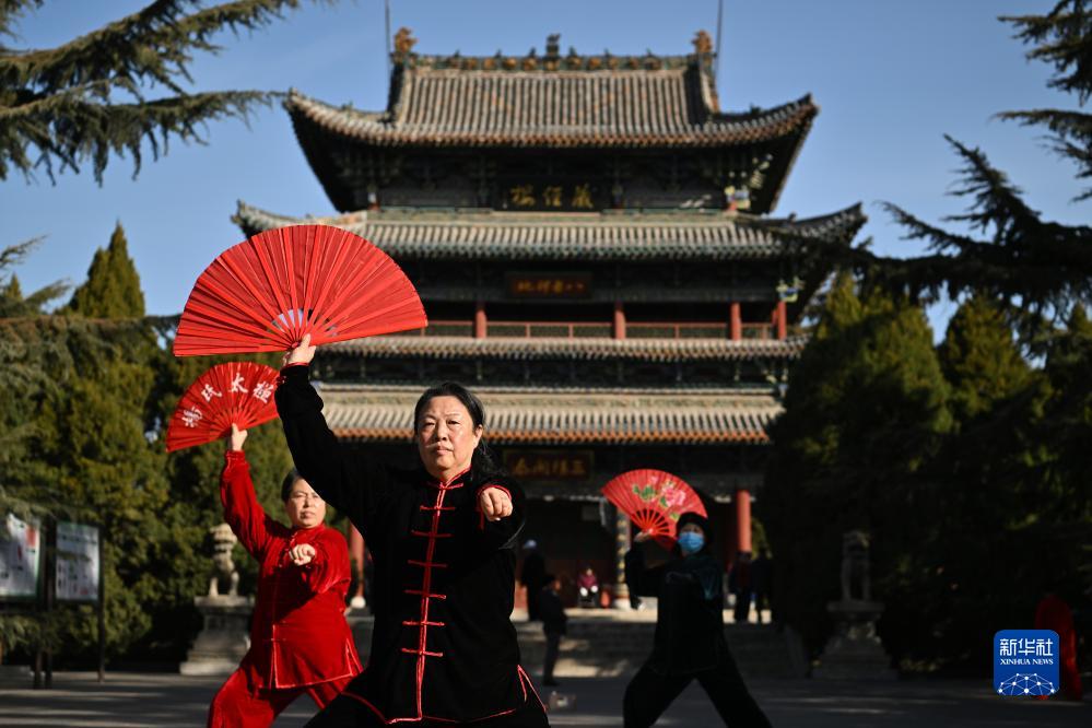 在太原市迎澤區迎澤公園,市民在練習太極扇(2023年3月1日攝)。新華社記者 詹彥 攝