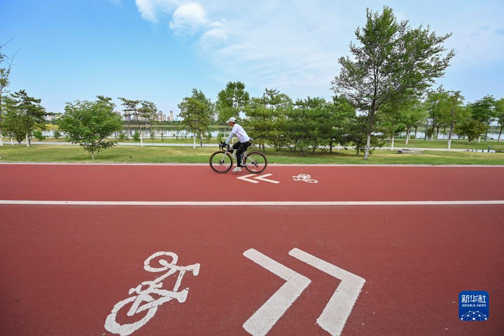 市民在太原市汾河公園內騎行(2023年6月27日)。新華社記者 楊晨光 攝