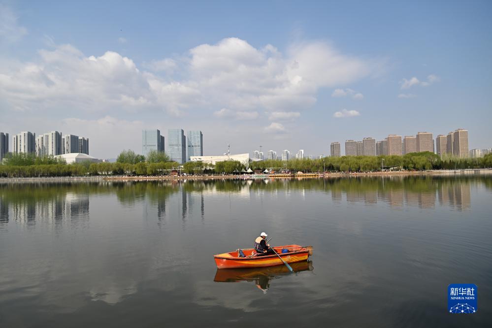 在太原市汾河公園,河道清潔工在清理汾河里的垃圾(2023年4月7日攝)。新華社記者 詹彥 攝