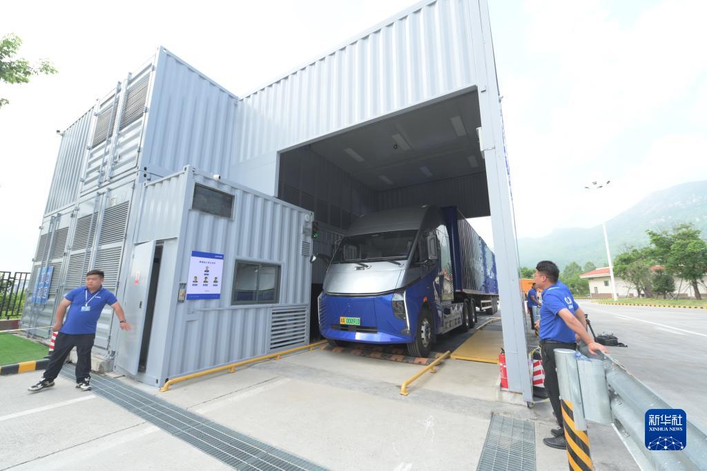 2023年8月24日,重型卡車在福州繞城高速公路長樂服務區的“騏驥”重卡換電站換電。新華社記者 林善傳 攝