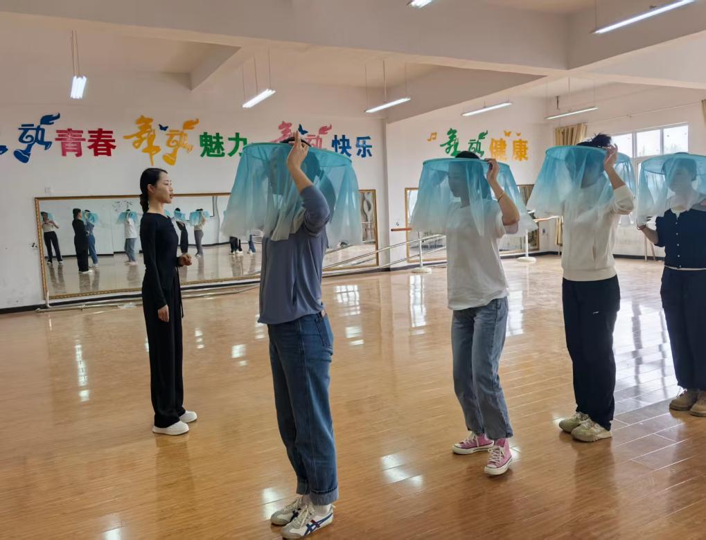 4月15日,龙玲(左一)在贵州省松桃苗族自治县大坪场镇进行“村晚”节目辅导。(受访者供图)