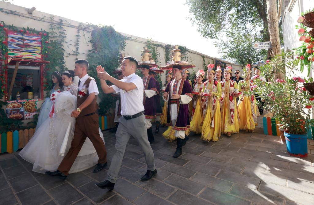 7月22日,在新疆库车市的龟兹小巷,表演萨玛瓦尔舞的演员参与当地的一场婚礼活动。新华社记者 王菲 摄