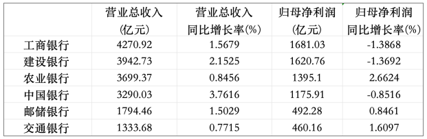 上半年,国有六大行营收均实现同比正增长,合计实现营收约1.83万亿元,合计实现归母净利润约6825亿元。具体来看,工商银行实现营收4270.92亿元,同比增长1.6%,营收规模稳居第一。中国银行实现营业收入3290.03亿元,以3.76%的增速成为六大行中营收增长最快的机构。建设银行、农业银行、邮储银行、交通银行营收依次为3942.73亿元、3699.37亿元、1794.46亿元、1333.68亿元,同比增幅2.15%、0.85%、1.5%、0.77%。