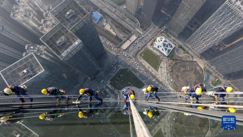 近日,高度335米的貴陽國際貿易中心雙子塔迎來今年的首次清洗。8名“蜘蛛人”從塔巔垂直而下開展高空作業,將耗時20天左右才能完成清洗。