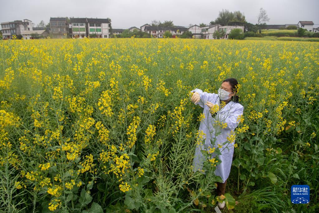 3月21日,重慶市農(nóng)科院研究員黃桃翠在“慶油3號(hào)”制種基地觀察油菜品種生長情況。