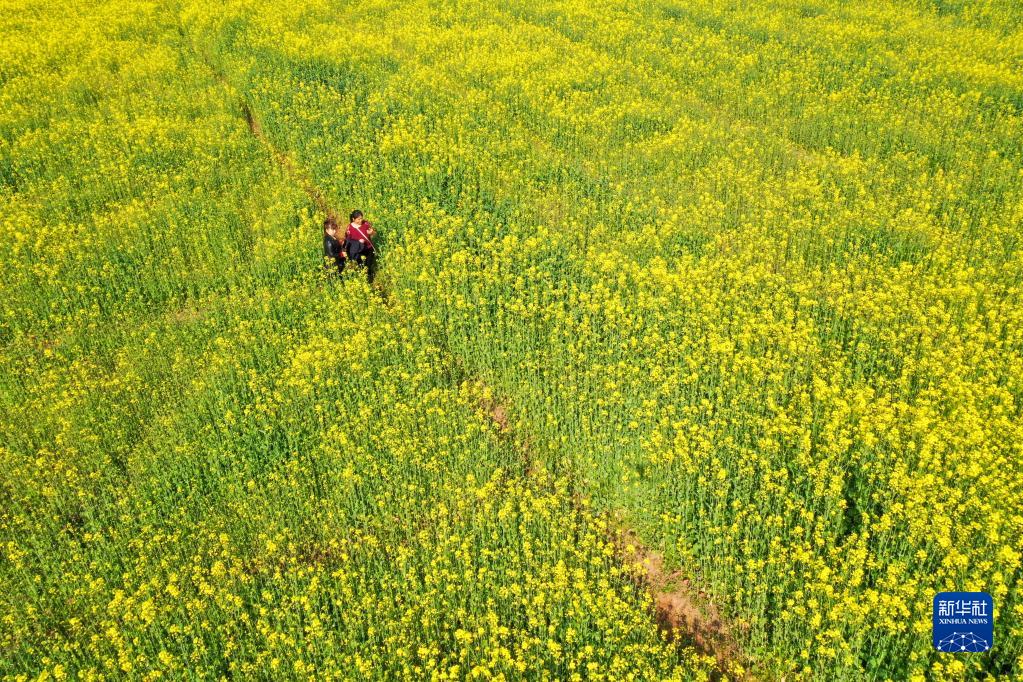 3月8日,游客在重慶市大足區中央城市花海公園的油菜花田游玩,該片油菜花田均為“慶油系列”油菜品種(無人機照片)。