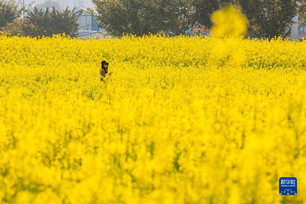 3月8日,游客在重慶市大足區中央城市花海公園的油菜花田游玩,該片油菜花田均為“慶油系列”油菜品種(無人機照片)。