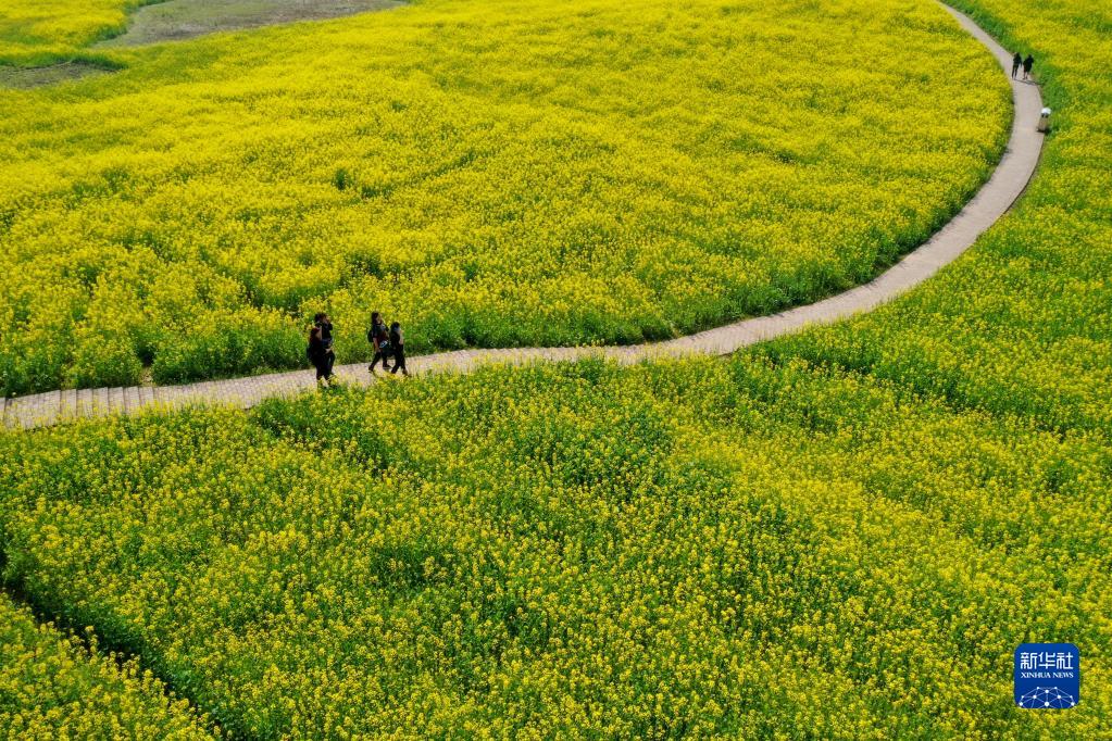 3月8日,游客在重慶市大足區(qū)中央城市花海公園的油菜花田游玩,該片油菜花田均為“慶油系列”油菜品種(無人機照片)。