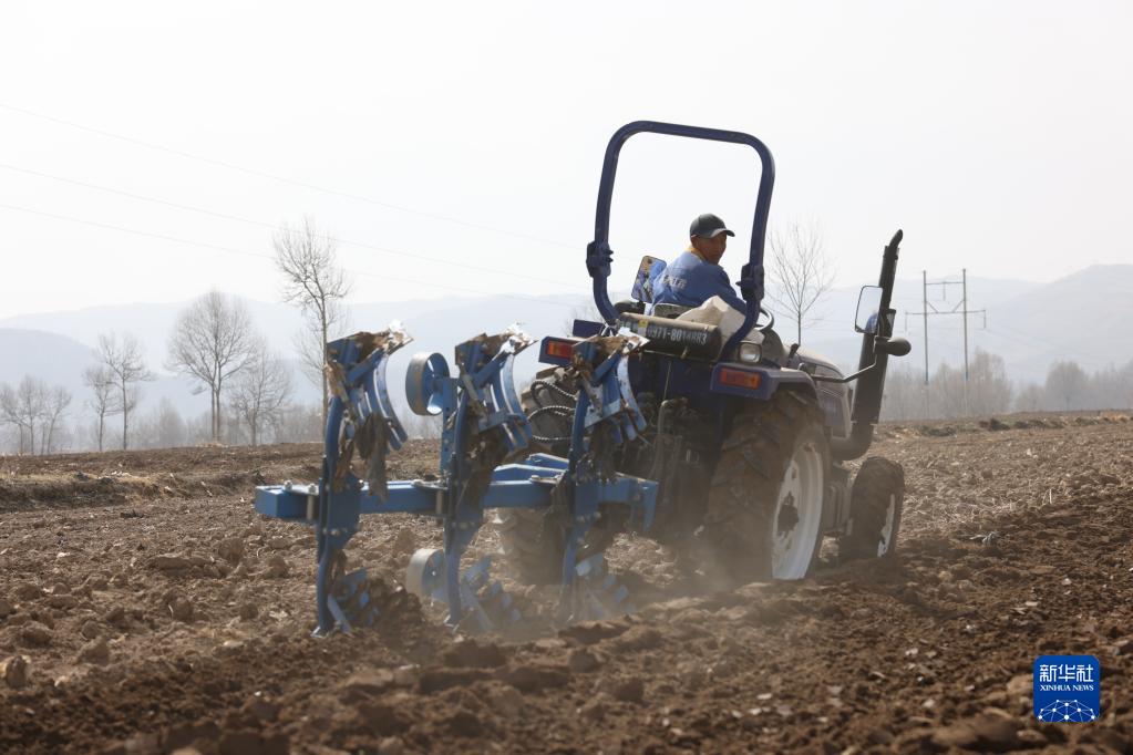 在青海省西寧市大通回族土族自治縣景陽鎮山城村,村民姜有盛駕駛拖拉機翻整土地(3月24日攝)。