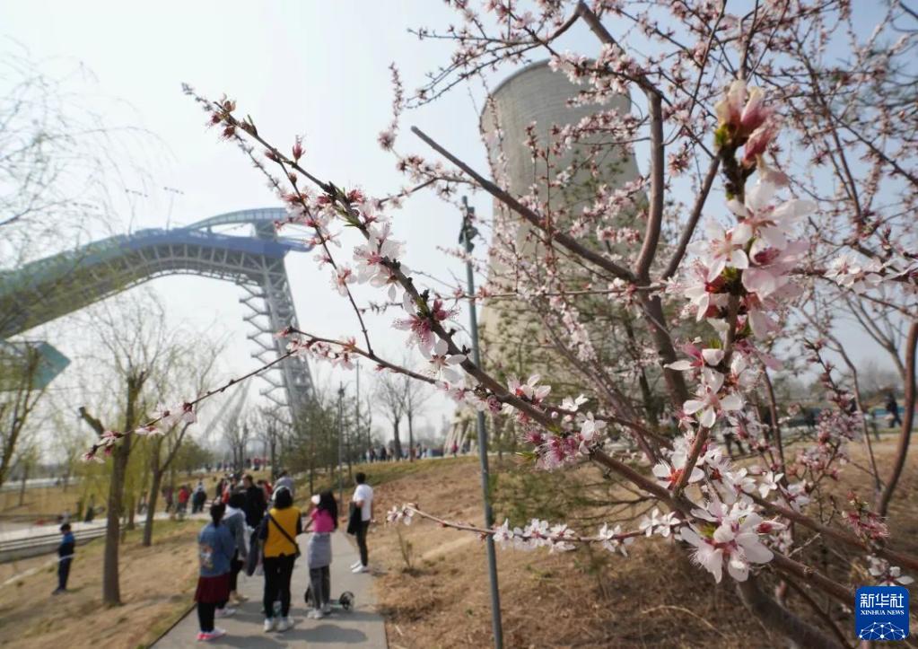4月4日,游客在北京首鋼滑雪大跳臺區域參觀游覽。