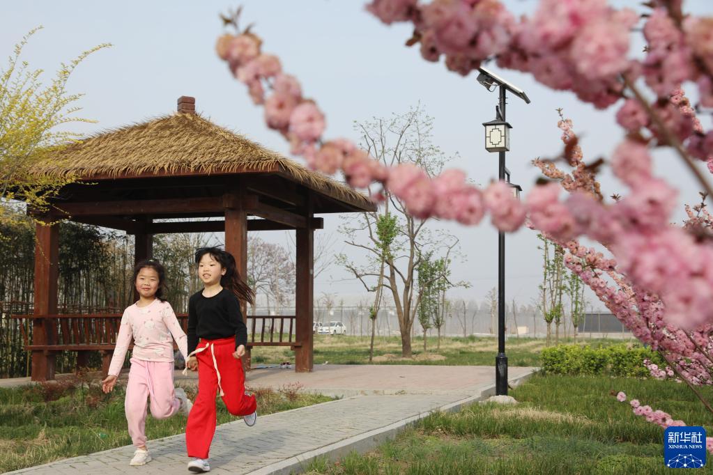 4月4日,小朋友們在河南省焦作市溫縣黃河灘區一處景點玩耍。