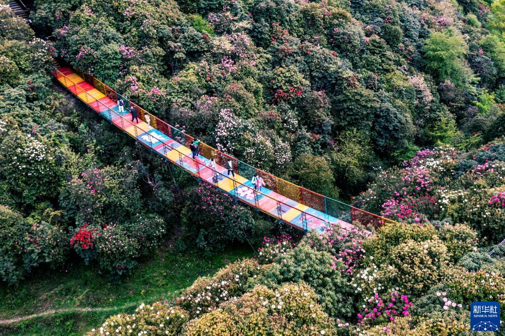 4月4日,游客在貴州省畢節市百里杜鵑金坡景區踏青賞花(無人機照片)。