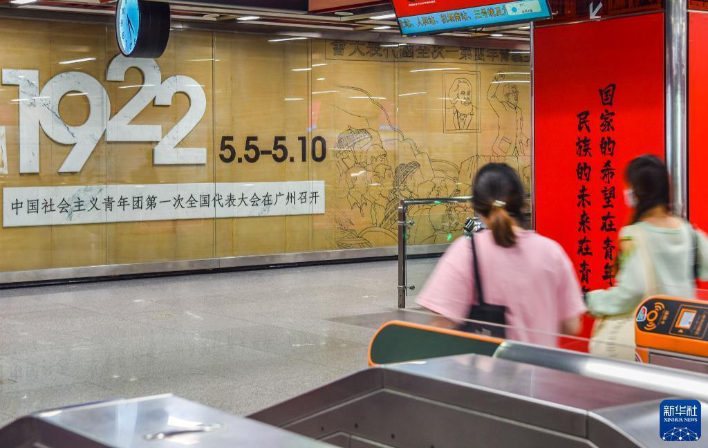 5月3日,修建在團(tuán)一大會(huì)址附近的廣州地鐵團(tuán)一大廣場(chǎng)站內(nèi)的“中國(guó)社會(huì)主義青年團(tuán)第一次全國(guó)代表大會(huì)”主題壁畫。