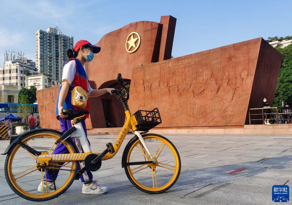 5月3日,廣州市第十三中學(xué)學(xué)生陳渝文利用假期在團一大廣場進行志愿服務(wù),她將隨意擺放的單車搬至廣場旁的停放點。