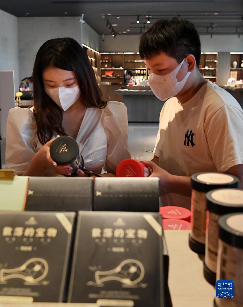 5月17日,兩位參觀者在河南博物院文創(chuàng)商店內挑選考古盲盒。