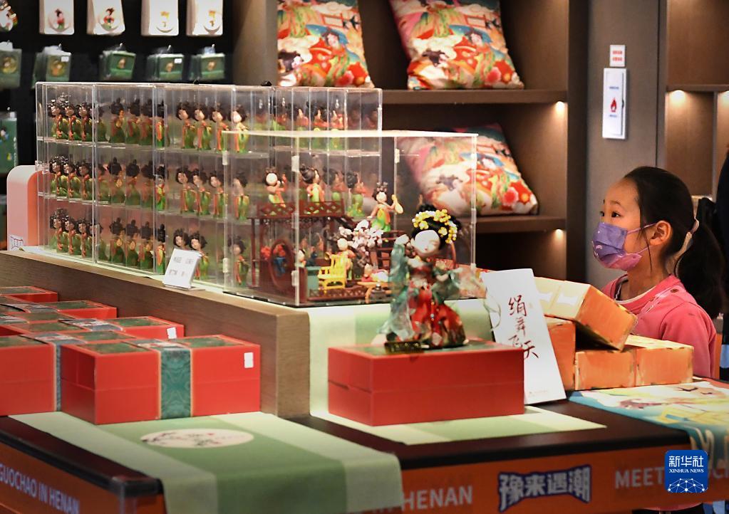 5月17日,一名小朋友在河南博物院文創商店內挑選文創產品。