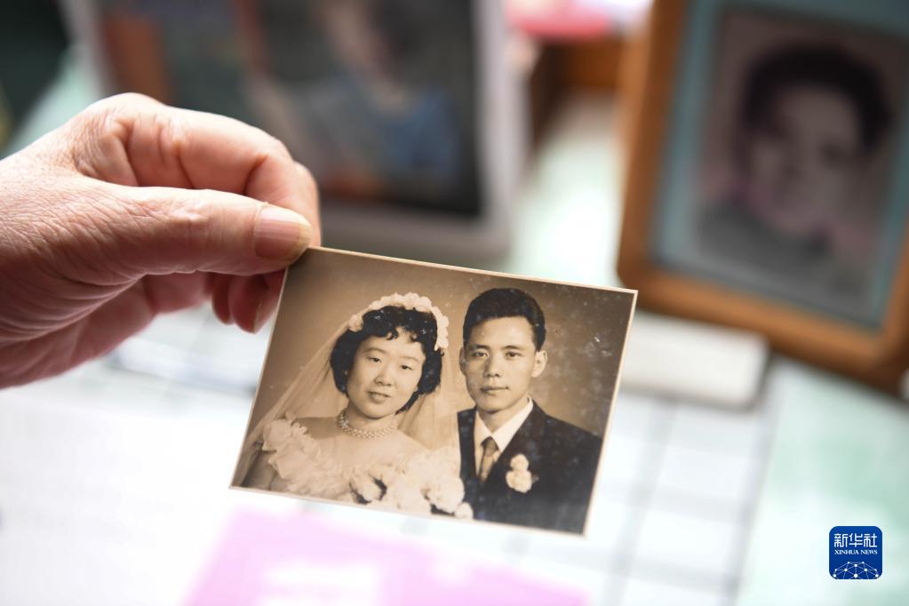 5月18日,張愛蘭在安徽蕪湖的家中展示她與丈夫徐國誠的結婚照。