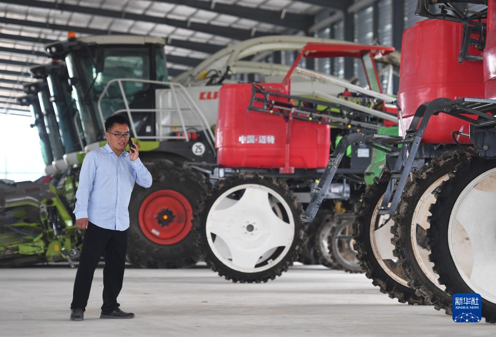 5月25日,沈興新在位于河南省鄧州市的公司農(nóng)機(jī)設(shè)備停放處接聽客戶電話。