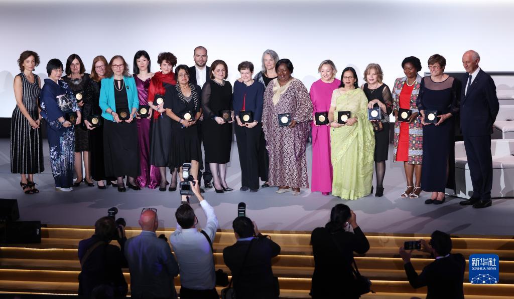 6月23日,在位于法國巴黎的聯合國教科文總部,榮獲2020、2021、2022年度“世界杰出女科學家獎”的15位獲獎者與聯合國教科文組織總干事奧德蕾·阿祖萊(左一)等在頒獎典禮后合影留念。